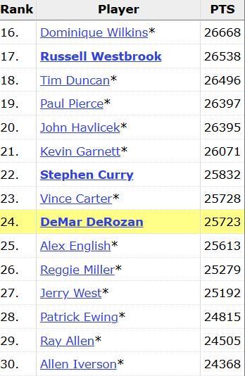 在第二节还剩10分05秒时,德罗赞罚球命中拿到本场第6分,超越文斯-卡特(25728分),升至NBA历史得分榜第23位。在德罗赞身前的是勇士球星斯蒂芬-库里,后者以25832分排名历史第22位,两人相差100分左右。