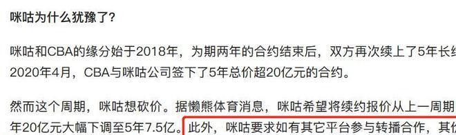 【资讯关键词】: 咪咕 直播 转播费 转播权 cba联赛